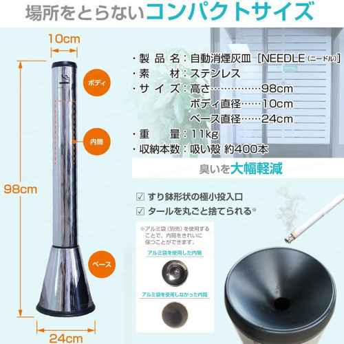 吸い殻投入口はすり鉢形状を採用しており、煙の漏れを最小限にとどめ、臭いが軽減される設計。
