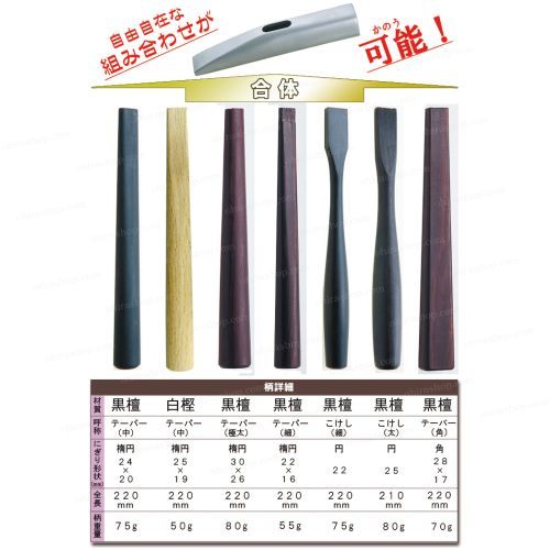 ハンマーの柄: ハンマー柄 白樫テーパー(中), ハンマー柄 白樫細首(細), ハンマー柄 白樫細首ヘラ, ハンマー柄 黒檀(こけし/細), ハンマー柄 黒檀(ひょうたん), ハンマー柄 黒檀(細首/太), ハンマー柄 黒檀こけし(太), ハンマー柄 黒檀ストレート, ハンマー柄 黒檀ストレート(極太), ハンマー柄 黒檀ストレート(超極太), ハンマー柄 黒檀テーパー(中), ハンマー柄 黒檀テーパー(太), ハンマー柄 黒檀テーパー(極太), ハンマー柄 黒檀テーパー(細), ハンマー柄 黒檀テーパー(角), ハンマー柄 黒檀細首(極細), ハンマー柄 黒檀細首(細), ハンマー柄 黒檀細首ヘラ