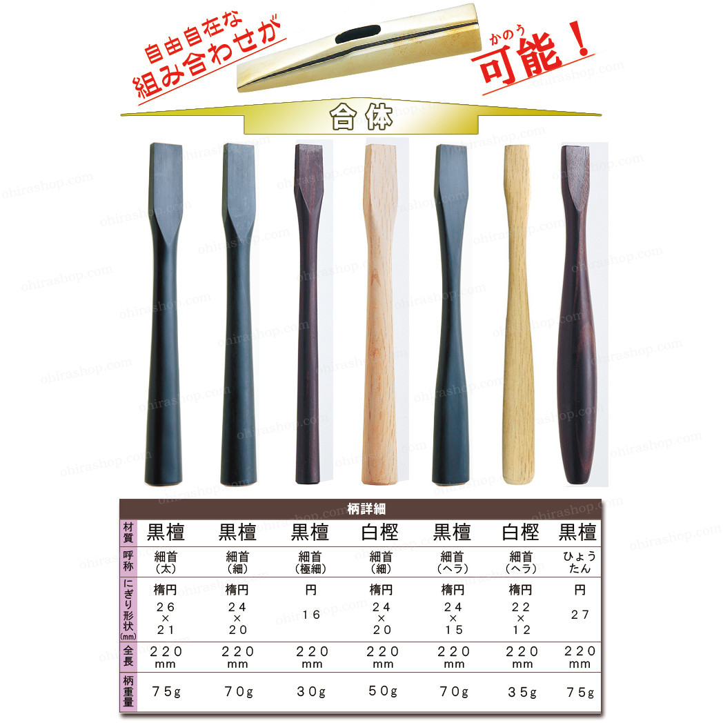 ハンマーの柄: ハンマー柄 白樫テーパー(中), ハンマー柄 白樫細首(細), ハンマー柄 白樫細首ヘラ, ハンマー柄 黒檀(こけし/細), ハンマー柄 黒檀(ひょうたん), ハンマー柄 黒檀(細首/太), ハンマー柄 黒檀こけし(太), ハンマー柄 黒檀ストレート, ハンマー柄 黒檀ストレート(極太), ハンマー柄 黒檀ストレート(超極太), ハンマー柄 黒檀テーパー(中), ハンマー柄 黒檀テーパー(太), ハンマー柄 黒檀テーパー(極太), ハンマー柄 黒檀テーパー(細), ハンマー柄 黒檀テーパー(角), ハンマー柄 黒檀細首(極細), ハンマー柄 黒檀細首(細), ハンマー柄 黒檀細首ヘラ