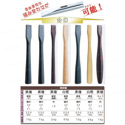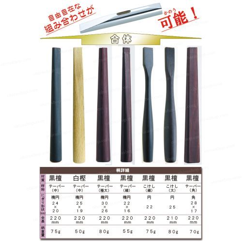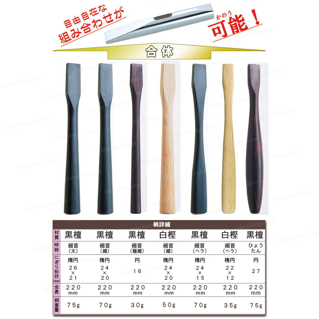 ハンマーの柄: ハンマー柄 白樫テーパー(中), ハンマー柄 白樫細首(細), ハンマー柄 白樫細首ヘラ, ハンマー柄 黒檀(こけし/細), ハンマー柄 黒檀(ひょうたん), ハンマー柄 黒檀(細首/太), ハンマー柄 黒檀こけし(太), ハンマー柄 黒檀ストレート, ハンマー柄 黒檀ストレート(極太), ハンマー柄 黒檀ストレート(超極太), ハンマー柄 黒檀テーパー(中), ハンマー柄 黒檀テーパー(太), ハンマー柄 黒檀テーパー(極太), ハンマー柄 黒檀テーパー(細), ハンマー柄 黒檀テーパー(角), ハンマー柄 黒檀細首(極細), ハンマー柄 黒檀細首(細), ハンマー柄 黒檀細首ヘラ