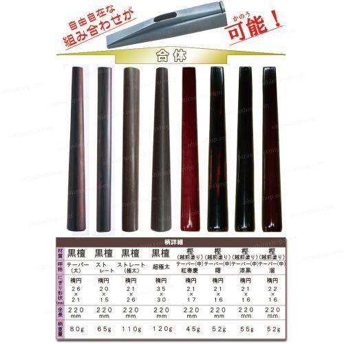 ハンマーの柄: ハンマー柄 白樫テーパー(中), ハンマー柄 白樫細首(細), ハンマー柄 白樫細首ヘラ, ハンマー柄 黒檀(こけし/細), ハンマー柄 黒檀(ひょうたん), ハンマー柄 黒檀(細首/太), ハンマー柄 黒檀こけし(太), ハンマー柄 黒檀ストレート, ハンマー柄 黒檀ストレート(極太), ハンマー柄 黒檀ストレート(超極太), ハンマー柄 黒檀テーパー(中), ハンマー柄 黒檀テーパー(太), ハンマー柄 黒檀テーパー(極太), ハンマー柄 黒檀テーパー(細), ハンマー柄 黒檀テーパー(角), ハンマー柄 黒檀細首(極細), ハンマー柄 黒檀細首(細), ハンマー柄 黒檀細首ヘラ